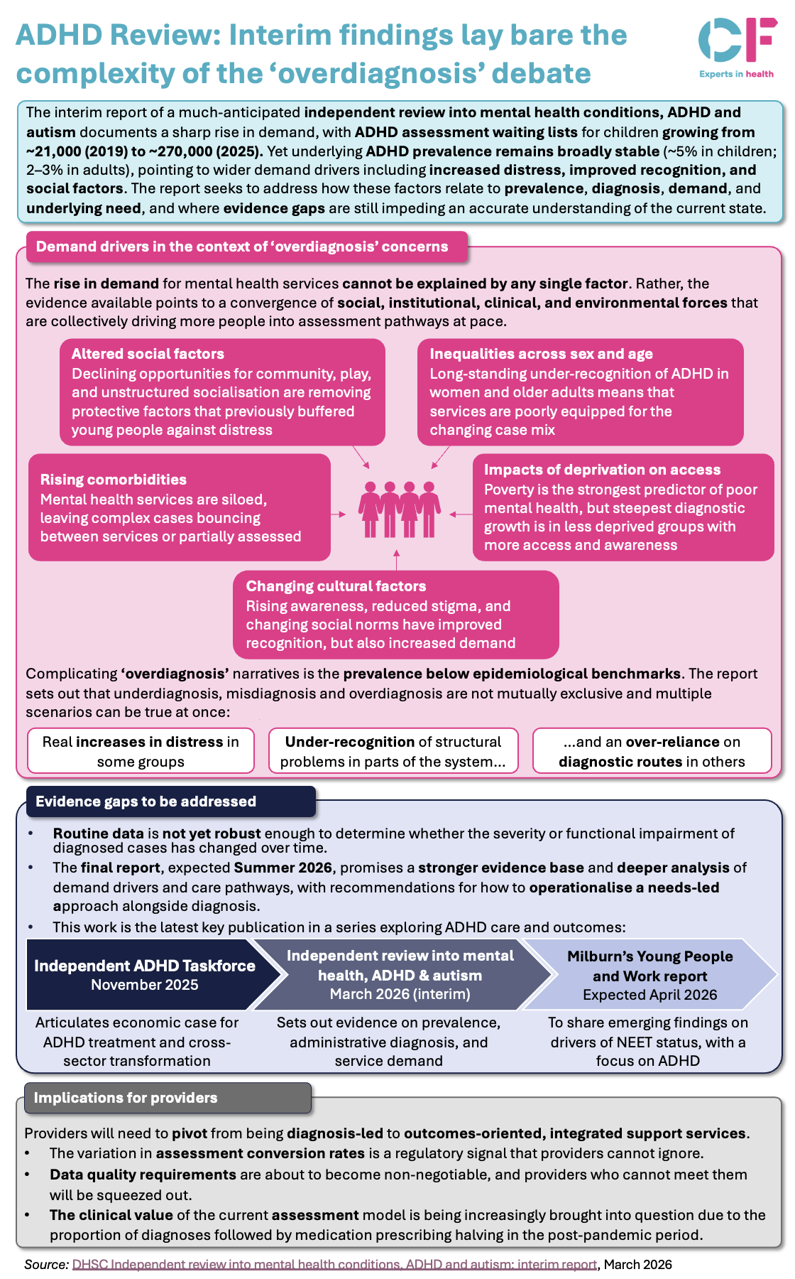 Amid growing debate around ADHD ‘overdiagnosis’, the UK Government’s Independent Review into Mental Health Conditions, ADHD and Autism has published its interim report, examining how converging demand drivers are reshaping care.