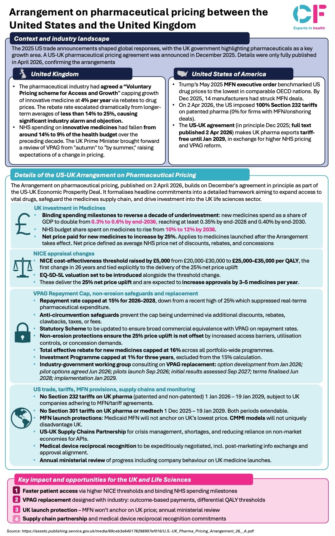 On 1 December 2025, the agreement was reached, aiming to secure and expand access to vital drugs for tens of thousands of NHS patients, safeguard the medicines supply chain, and drive crucial investment into the UK Life Science Sector, whilst enabling UK patients to access a wide range of groundbreaking new treatments. The details have now been fully published in April 2026.