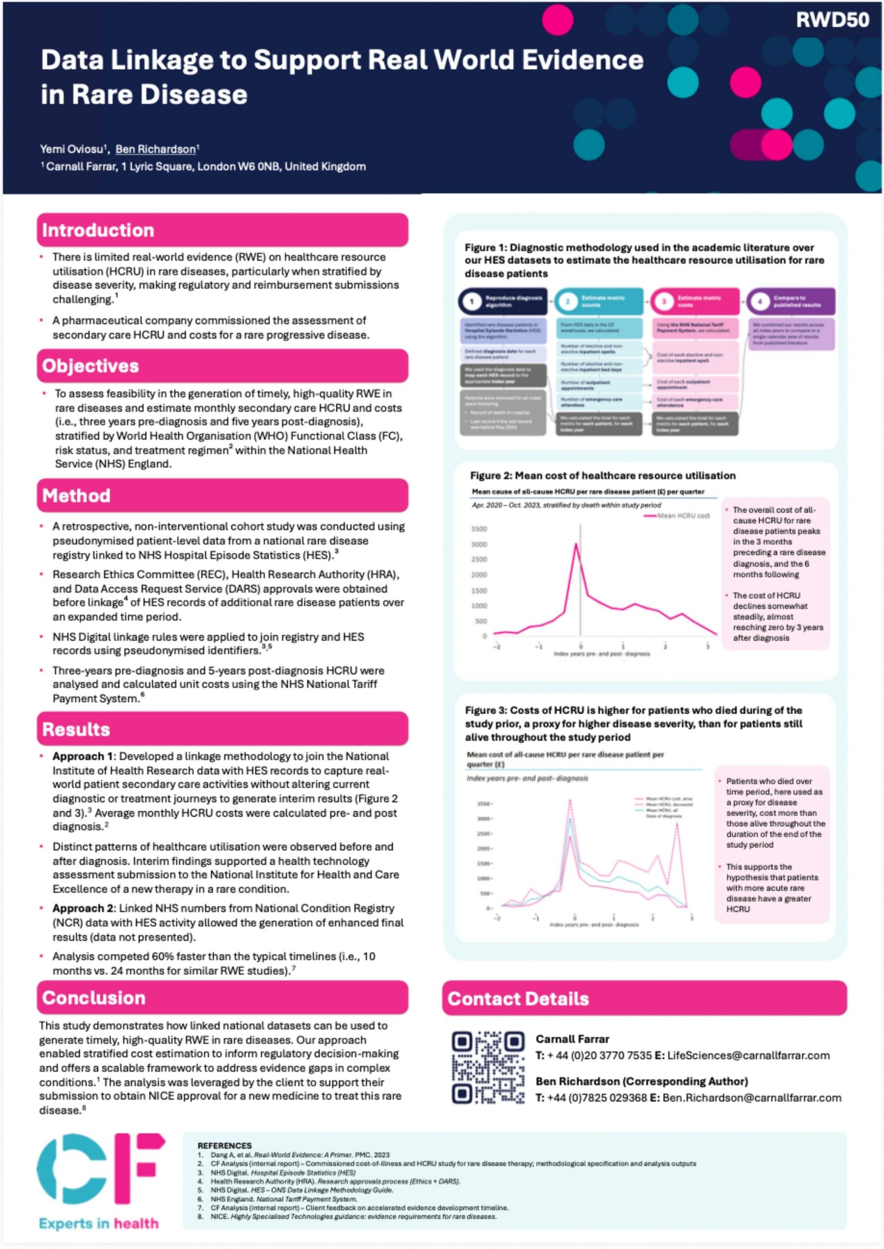 CF developed an innovative data linkage methodology that connects national rare disease registry data with NHS Hospital Episode Statistics to generate comprehensive real-world evidence. This approach enabled us to analyse healthcare resource utilisation patterns three years before and five years after diagnosis, providing critical insights for rare disease management.