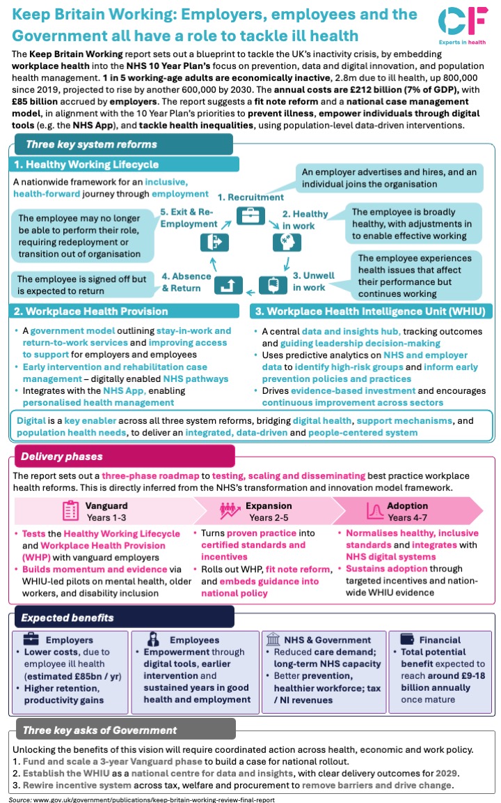 1 in 5 working-age adults are currently economically inactive, 2.8m of those due to ill health, costing the economy an estimated £212 billion per year, or 7% of GDP. The UK Government’s “Keep Britain Working” report outlines an ambitious blueprint to tackle the country’s inactivity crisis. The report calls for embedding workplace health at the heart of NHS policy and broader population health strategy policymaking.
