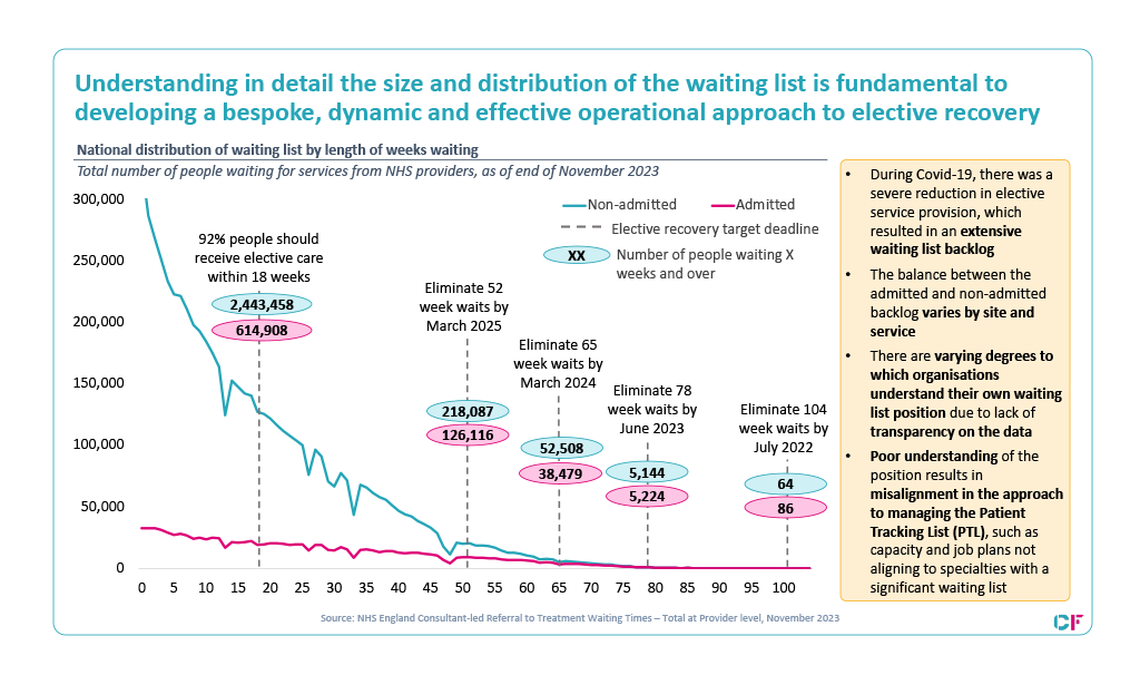 To fulfil these ambitions the NHS has two months to eliminate 65 week waits and fourteen months to eliminate 52 week waits, which will require an understanding of the distribution of elective waiting lists by organisation, site and service to allow for better alignment of capacity to patient need.