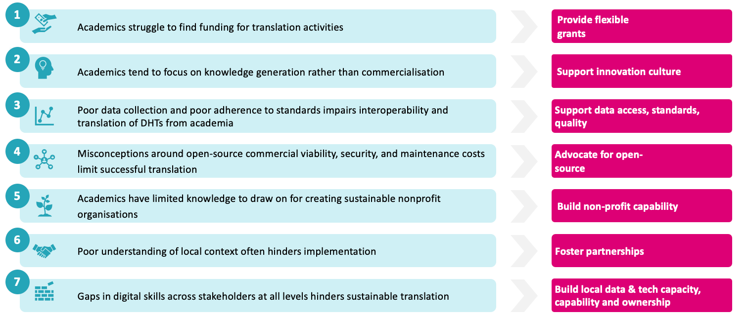 Through literature review, extensive individual engagement of global digital health stakeholders, a global survey and delivery of 4 focus groups, we identified 7 high-level barriers with corresponding recommendations that funders can implement to increase the likelihood of successful translation.